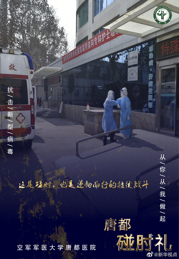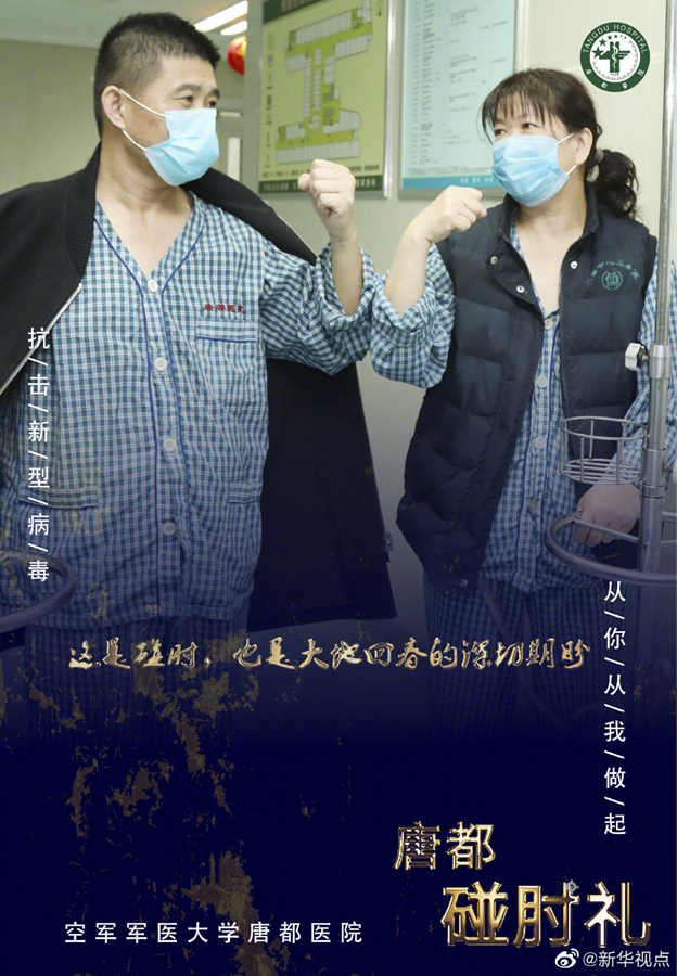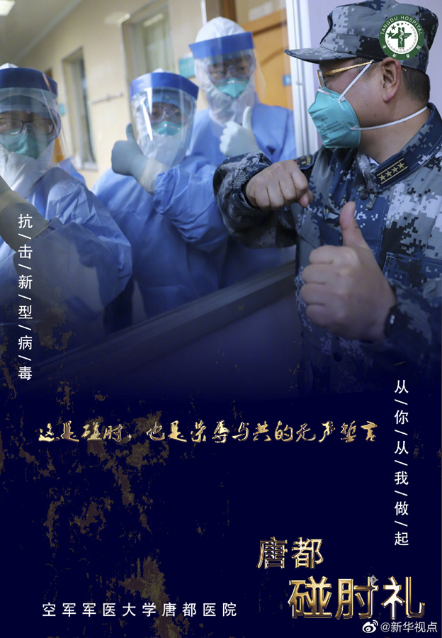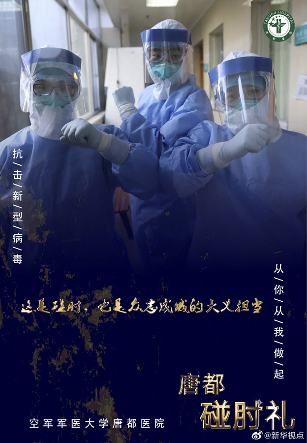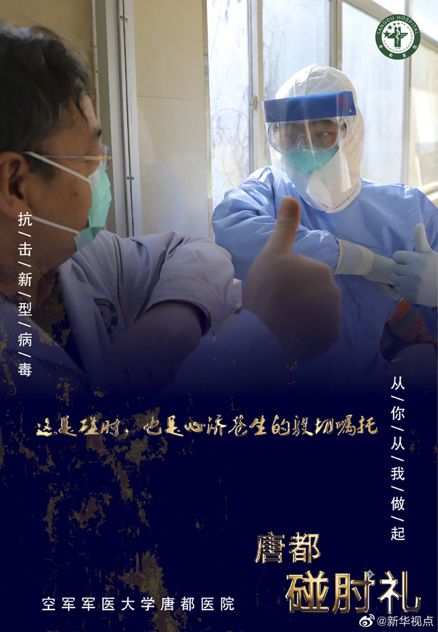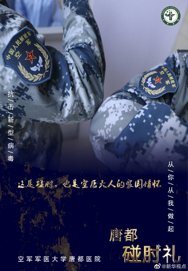 疫情當(dāng)前,空軍軍醫(yī)大學(xué)唐都醫(yī)院的醫(yī)護(hù)人員在抗擊疫情的同時(shí),用新的肢體語(yǔ)言——“碰肘禮”,相互問候,相互加油。肘碰肘,心連心,萬眾一心,定能戰(zhàn)勝病毒。(文字藺娟;圖片由空軍軍醫(yī)大學(xué)唐都醫(yī)院提供) ????