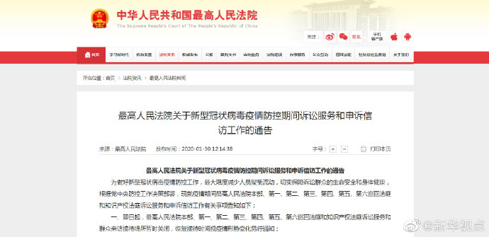 最高人民法院30日發(fā)布通告,即日起,最高人民法院本部、第一、第二、第三、第四、第五、第六巡回法庭和知識(shí)產(chǎn)權(quán)法庭訴訟服務(wù)和群眾來訪接待場所暫時(shí)關(guān)閉,恢復(fù)接待時(shí)間視疫情形勢變化另行通知;當(dāng)事人需要提交申請?jiān)賹彶牧?、申訴信訪或者申請其他訴訟服務(wù)事項(xiàng)的,請通過最高人民法院訴訟服務(wù)網(wǎng)或者郵寄方式提交,查詢咨詢事項(xiàng)可撥打12368訴訟服務(wù)熱線聯(lián)系辦理。(記者羅沙)?