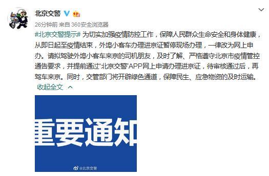 警方提醒,請(qǐng)擬駕駛外埠小客車來(lái)京的司機(jī)朋友,及時(shí)了解、嚴(yán)格遵守北京市疫情管控通告要求,并提前通過(guò)“北京交警”APP網(wǎng)上申請(qǐng)辦理進(jìn)京證,待審核通過(guò)后,再駕車來(lái)京。同時(shí),交管部門(mén)將開(kāi)辟綠色通道,保障民生、應(yīng)急物資的及時(shí)運(yùn)輸。