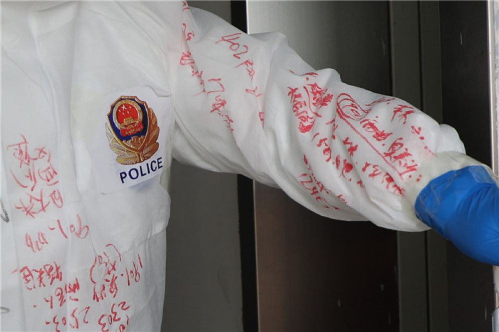 用紅色簽字筆寫(xiě)在防護(hù)服上醒目的位置