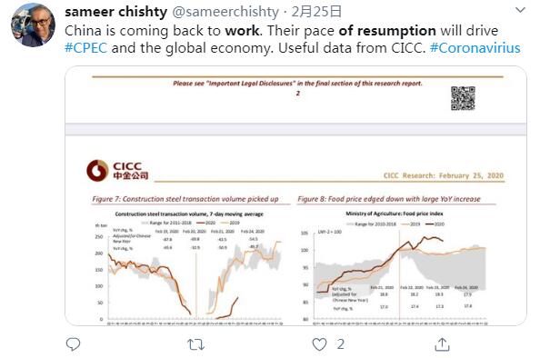 推特用戶sameer chishty說:中國正在復(fù)工復(fù)產(chǎn)。他們的這一步伐將驅(qū)動全球經(jīng)濟(jì)增長。