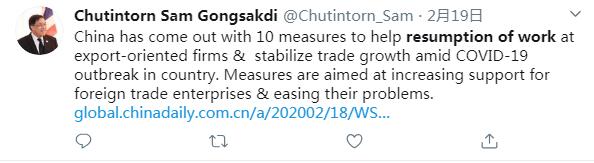 推特用戶Chutintorn Sam Gongsakdi說:在應(yīng)對新冠肺炎疫情期間,中國出臺了10項措施來幫助出口企業(yè)復(fù)工復(fù)產(chǎn),并推動貿(mào)易的穩(wěn)定增長。這些措施旨在加強(qiáng)對外貿(mào)企業(yè)的支持,并解決它們面臨的問題。