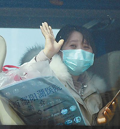 2月22日,江西中醫(yī)藥大學附屬醫(yī)院撫生院區(qū),11名此前由其他醫(yī)療機構(gòu)轉(zhuǎn)入該院的新冠肺炎患者治愈出院,其中有8人在該院接受了中醫(yī)治療,3人接受中西醫(yī)結(jié)合治療。圖為出院的病人向醫(yī)護人員揮手告別。時 雨攝(影像中國)