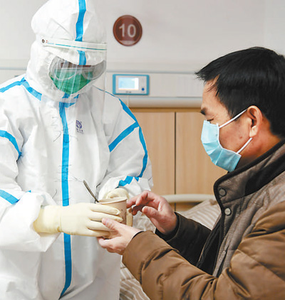 2月18日,在江西中醫(yī)藥大學(xué)附屬醫(yī)院撫生院區(qū)新冠肺炎患者的隔離病房內(nèi),護(hù)士將中藥湯劑端給患者。時(shí) 雨攝(影像中國)