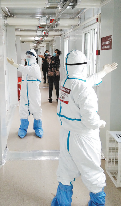 武漢雷神山醫(yī)院,上海支援湖北醫(yī)療隊(duì)的醫(yī)護(hù)人員在教患者按照“六字訣”中醫(yī)功法進(jìn)行鍛煉。姜泓冰 龔亞斌攝影報(bào)道