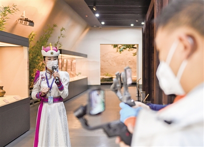 2020年3月7日,內(nèi)蒙古呼和浩特市昭君博物院金牌講解員在進行5G文旅直播,讓公眾足不出戶感受“單于和親”“昭君出塞”的歷史文化魅力。丁根厚攝/光明圖片