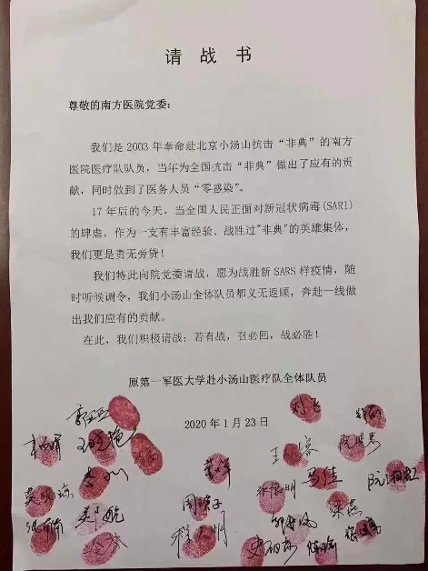 △1月23日,曾參加原第一軍醫(yī)大學(xué)赴小湯山醫(yī)療隊(duì)的南方醫(yī)院24名醫(yī)護(hù)人員寫下請(qǐng)戰(zhàn)書(shū),主動(dòng)要求赴一線工作。