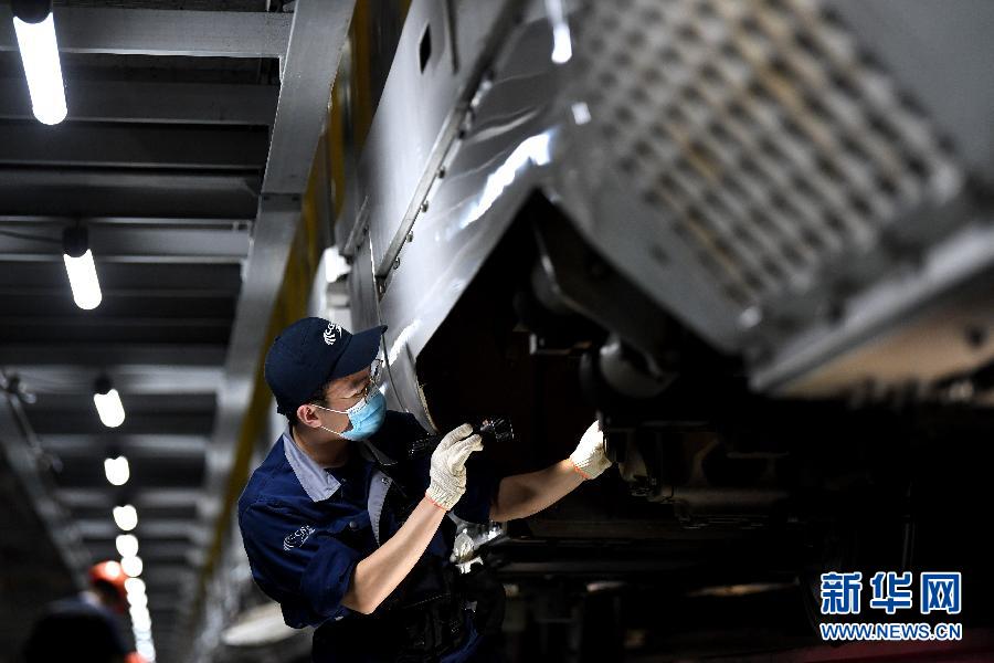 4月29日夜,合肥南動(dòng)車運(yùn)用所的工作人員對動(dòng)車組進(jìn)行檢修。新華社記者劉軍喜攝