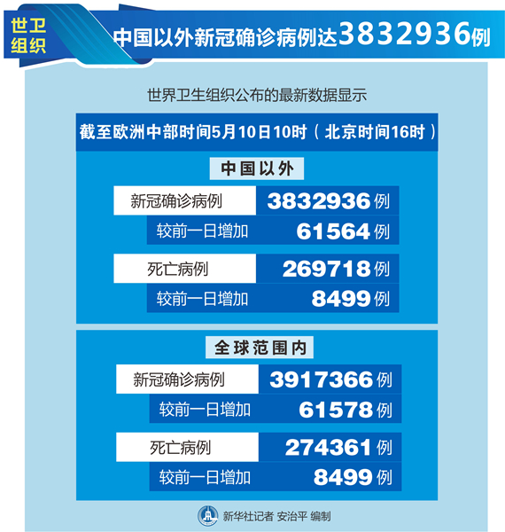 世衛(wèi)組織每日疫情報告顯示,截至歐洲中部時間10日10時(北京時間16時),中國以外新冠確診病例較前一日增加61564例,達(dá)到3832936例;中國以外死亡病例較前一日增加8499例,達(dá)到269718例。