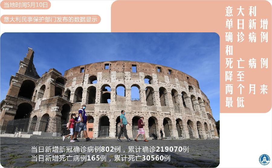 新華社羅馬5月10日電(記者李潔)意大利民事保護部門10日發(fā)布的數(shù)據(jù)顯示,意大利當(dāng)天新增新冠確診病例802例,累計確診219070例;新增死亡病例165例,累計死亡30560例。單日新增確診病例和新增死亡病例均為過去兩個月來最低水平。