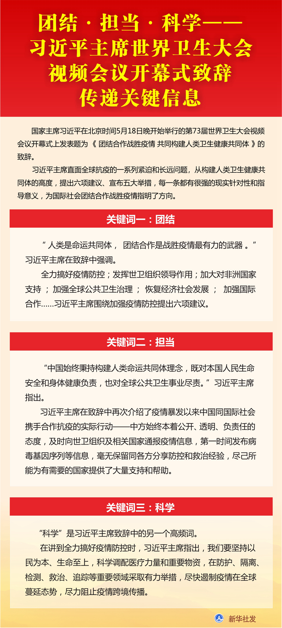 新華社北京5月18日電? 綜合新華社駐外記者報道:國家主席習(xí)近平18日晚在第73屆世界衛(wèi)生大會視頻會議開幕式上發(fā)表題為《團結(jié)合作戰(zhàn)勝疫情 共同構(gòu)建人類衛(wèi)生健康共同體》的致辭。世界衛(wèi)生組織官員及多國人士認為,習(xí)近平主席在致辭中提出的加強疫情防控六項建議、中國為推進全球抗疫合作的五大舉措秉持構(gòu)建人類命運共同體理念,體現(xiàn)了中國負責(zé)任大國擔(dān)當(dāng),對推動抗擊疫情國際合作具有重要意義。