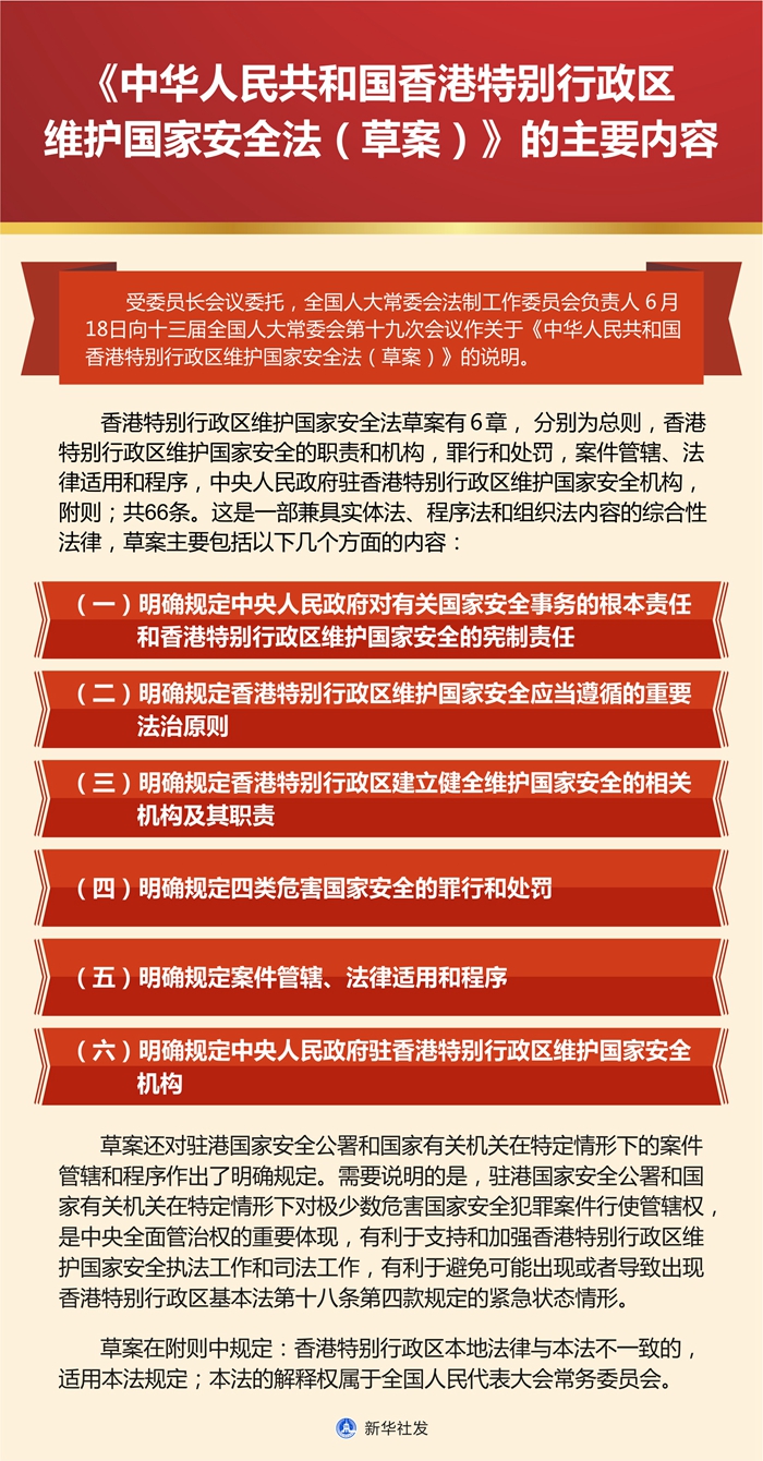 香港特別行政區(qū)維護(hù)國家安全法草案有6章,分別為總則,香港特別行政區(qū)維護(hù)國家安全的職責(zé)和機(jī)構(gòu),罪行和處罰,案件管轄、法律適用和程序,中央人民政府駐香港特別行政區(qū)維護(hù)國家安全機(jī)構(gòu),附則;共66條。這是一部兼具實(shí)體法、程序法和組織法內(nèi)容的綜合性法律,草案主要包括以下幾個(gè)方面的內(nèi)容: