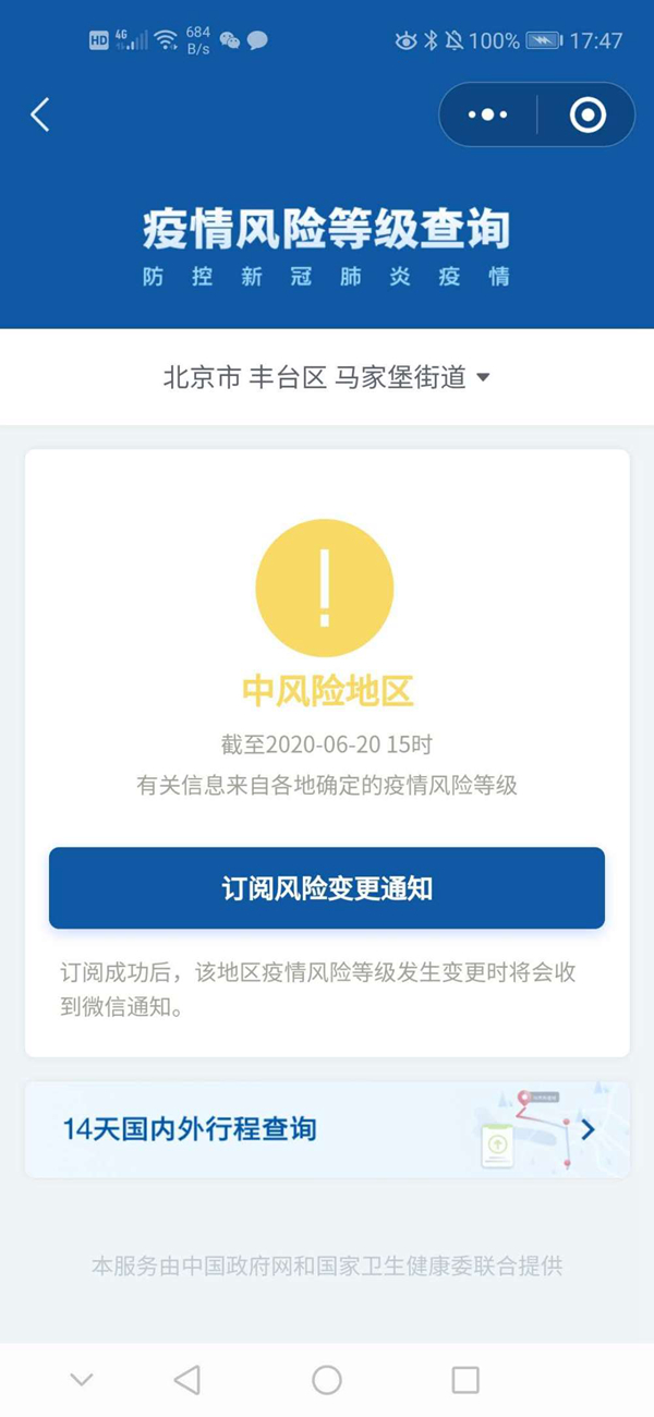 記者從國務(wù)院客戶端小程序“疫情風(fēng)險(xiǎn)等級(jí)查詢”上了解到,截至6月20日15時(shí),北京豐臺(tái)馬家堡街道升級(jí)為中風(fēng)險(xiǎn)地區(qū)。