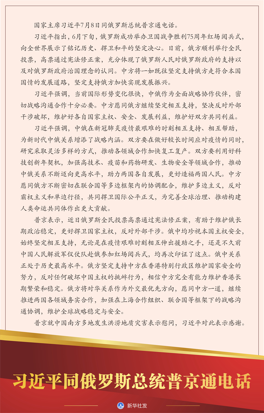習(xí)近平強(qiáng)調(diào),中俄在新冠肺炎疫情最艱難的時(shí)刻相互支持、相互幫助,為新時(shí)代中俄關(guān)系增添了戰(zhàn)略內(nèi)涵。雙方要在做好較長時(shí)間應(yīng)對疫情的同時(shí),研究采取靈活多樣的方式,推動各領(lǐng)域合作加快復(fù)工復(fù)產(chǎn)。雙方要利用好科技創(chuàng)新年契機(jī),加強(qiáng)高技術(shù)、疫苗和藥物研發(fā)、生物安全等領(lǐng)域合作,推動中俄關(guān)系不斷邁向更高水平,助力兩國各自發(fā)展,更好造福兩國人民。中方愿同俄方不斷密切在聯(lián)合國等多邊框架內(nèi)的協(xié)調(diào)配合,維護(hù)多邊主義,反對霸權(quán)主義和單邊行徑,共同捍衛(wèi)國際公平正義,為完善全球治理、推動構(gòu)建人類命運(yùn)共同體作出更大貢獻(xiàn)。