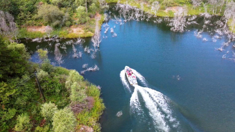 8月21日拍攝的北京市密云水庫綜合執(zhí)法大隊水上分隊隊員執(zhí)行任務(wù)(無人機(jī)拍攝)(記者夏子麟攝)