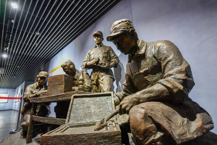 這是在“太行革命根據(jù)地的新聞工作者”展廳內(nèi)拍攝的新聞工作者雕像(11月5日攝)。