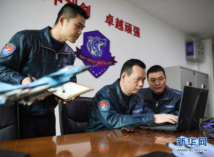 12月7日,王建東(中)與戰(zhàn)友一起進(jìn)行航理學(xué)習(xí)研究。新華社發(fā)(唐俊 攝)