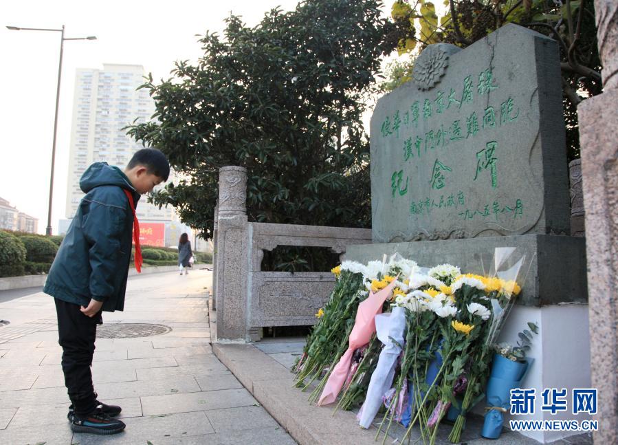 12月12日,一名小學(xué)生在侵華日軍南京大屠殺漢中門外遇難同胞紀(jì)念碑前鞠躬。新華社發(fā)(劉建華 攝)