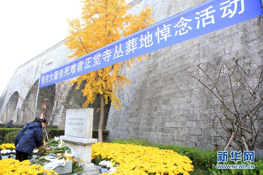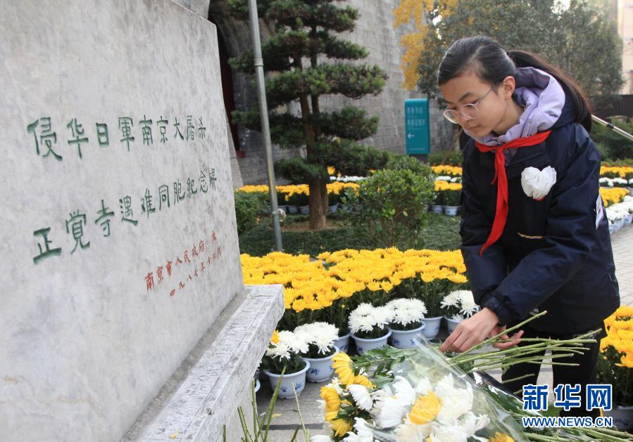 12月12日,在侵華日軍南京大屠殺死難同胞叢葬地(正覺寺),參加悼念活動的小學(xué)生向遇難同胞紀(jì)念碑獻(xiàn)花。新華社發(fā)(劉建華 攝)