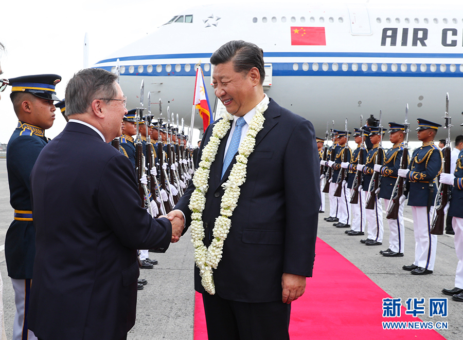當?shù)貢r間上午11時45分許,習近平乘坐專機抵達馬尼拉阿基諾國際機場。習近平步出艙門,菲律賓政府高級官員在舷梯旁熱情迎接,軍樂隊奏迎賓曲。禮兵分列紅地毯兩側(cè)。菲律賓青年向習近平獻上茉莉花環(huán)。