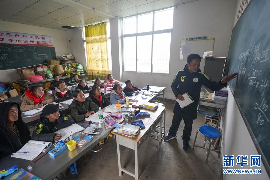 瓦吾小學教師曲比史古(右一)在給五年級學生上數(shù)學課(5月27日攝)。新華社記者 沈伯韓 攝