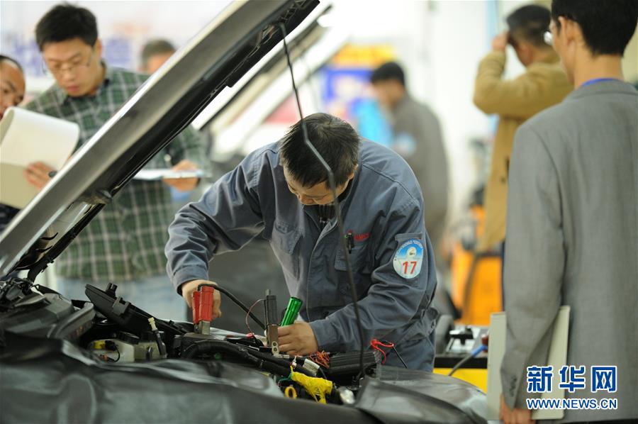 參賽選手在貴陽市第二屆技能之星競技大賽決賽汽車維修項目比賽中(2015年11月17日攝)。大賽吸引5000余名來自貴州省中、高等職業(yè)院校的學生參加。新華社記者 陶亮 攝