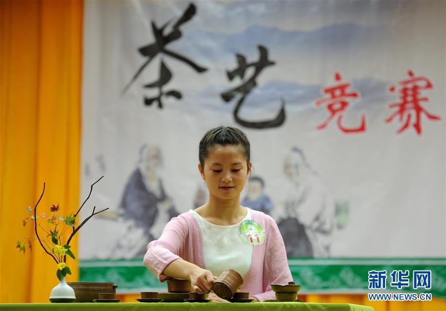 參賽選手在貴陽市第二屆技能之星競技大賽決賽茶藝展示比賽中(2015年11月17日攝)。大賽吸引5000余名來自貴州省中、高等職業(yè)院校的學生參加。新華社記者 陶亮 攝