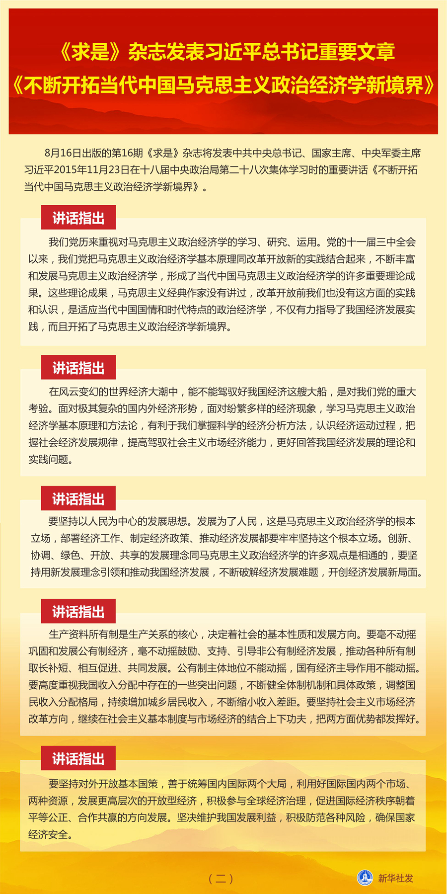 新華社北京8月15日電 8月16日出版的第16期《求是》雜志將發(fā)表中共中央總書記、國(guó)家主席、中央軍委主席習(xí)近平2015年11月23日在十八屆中央政治局第二十八次集體學(xué)習(xí)時(shí)的重要講話《不斷開拓當(dāng)代中國(guó)馬克思主義政治經(jīng)濟(jì)學(xué)新境界》。