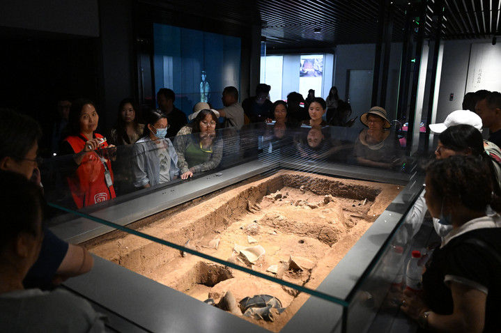 2025年4月16日,游客在位于河南省洛阳市偃师区的二里头夏都遗址博物馆参观。二里头遗址是探索中国最早的王朝文明——夏商文明及其分界的关键性遗址,曾两次入选“全国十大考古新发现”。博物馆开放后,已成为洛阳最热门的文化旅游目的地之一。
