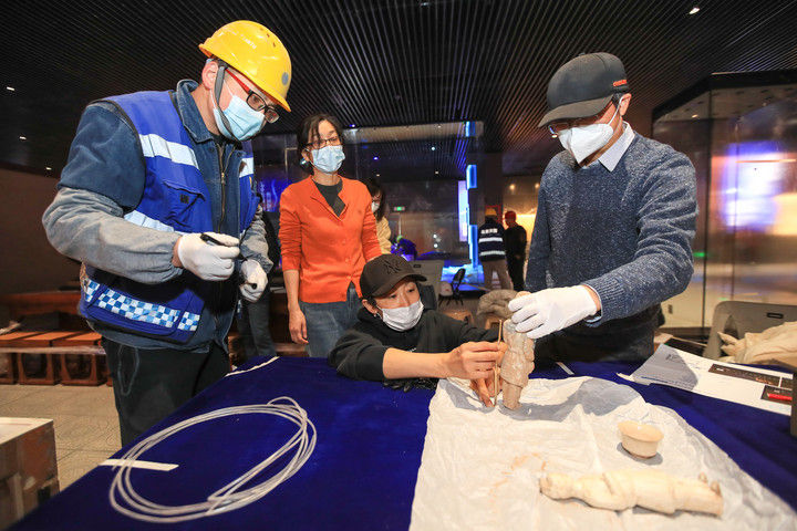 2023年12月,首都博物馆专家(左三)为北京大运河博物馆(首都博物馆东馆)的“京华通惠 运河永济——北京与大运河历史文化陈列”进行布展指导。