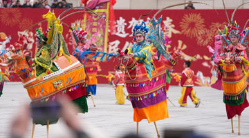 3月1日,甘肃省白银市会宁县会师镇北关社火队在会宁县城进行高跷巡演。