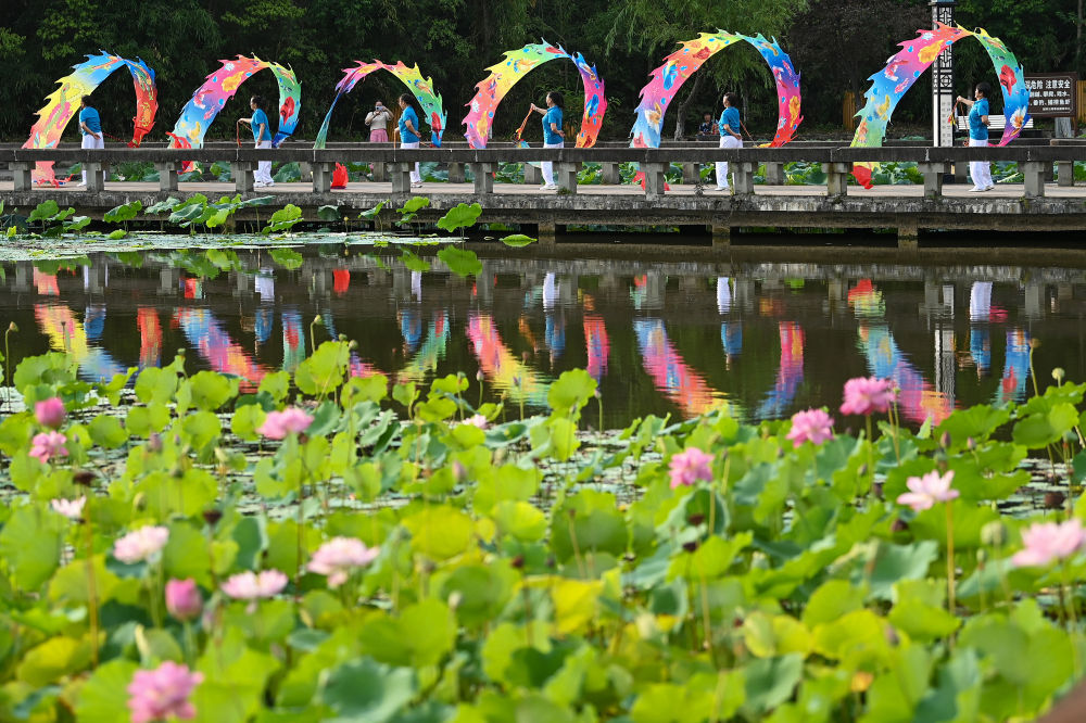 ↑8月6日,健身爱好者在四川省南充市蓬安县相如文化公园练习舞“彩带龙”。