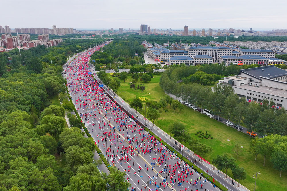 ↑8月10日,参赛选手在山西省临汾市汾河文化生态景区内参加健康长跑比赛。