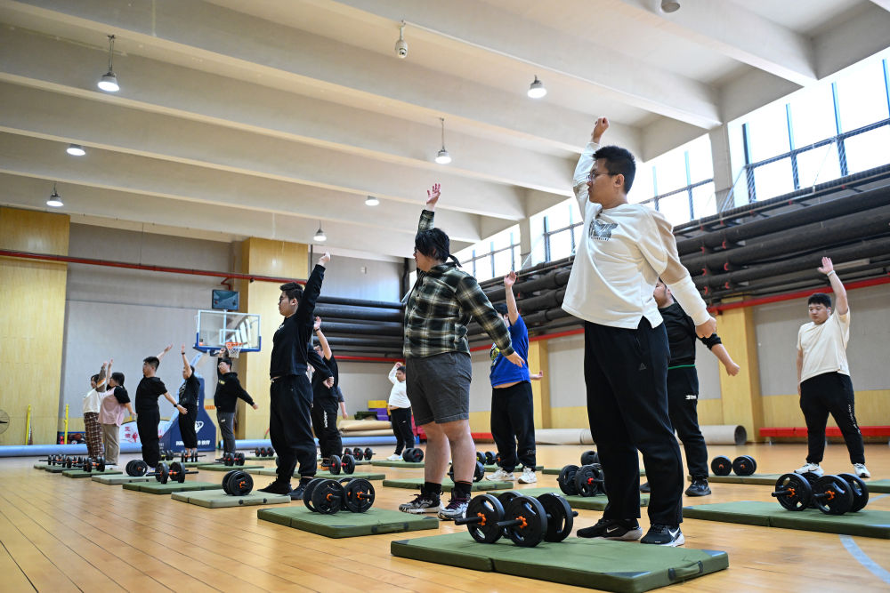 ↑5月15日,人们在河北省石家庄市长安区一家体育健身馆打羽毛球。