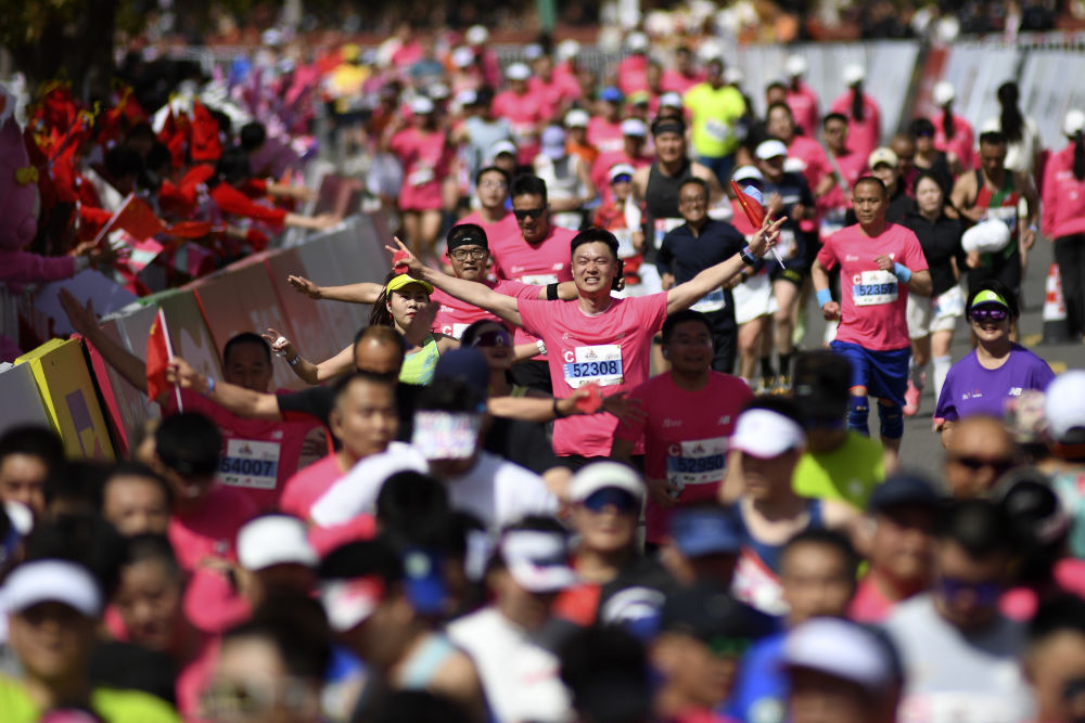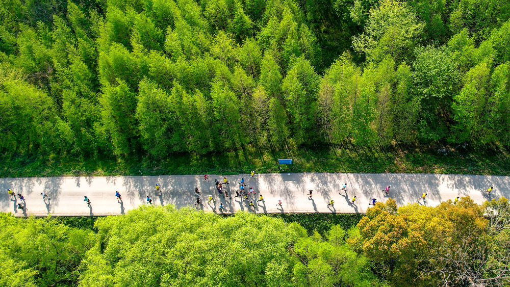 ↑4月13日,参赛选手在2025淮安马拉松暨大运河马拉松系列赛(淮安站)比赛中。