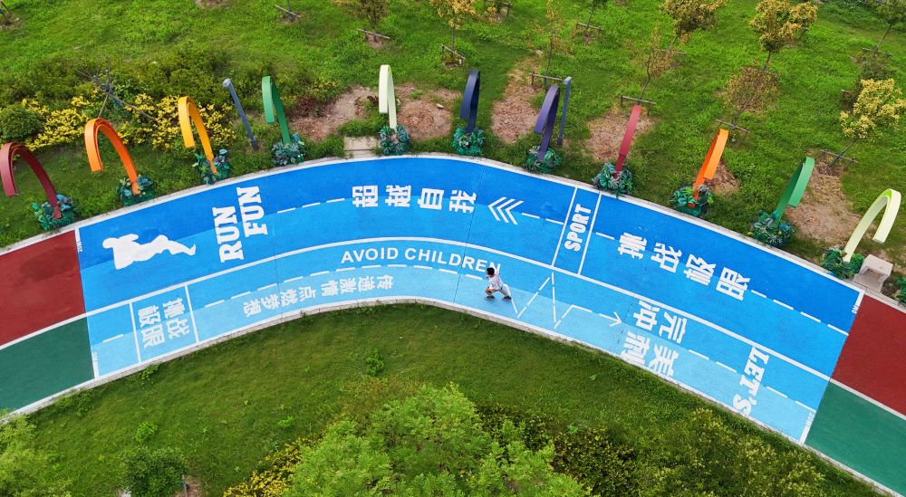 ↑4月13日,在四川省眉山市东坡区苏轼公园内一处“口袋球场”,市民在打乒乓球、羽毛球(无人机照片)。