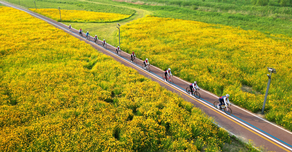 ↑5月30日,骑行爱好者在山东省东营市东营区耿井湿地骑行健身。