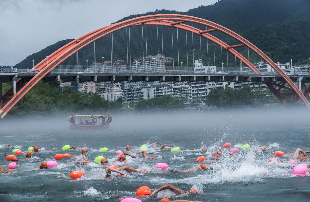 ↑7月27日,在浙江省建德市,游泳爱好者参加横渡新安江挑战赛。