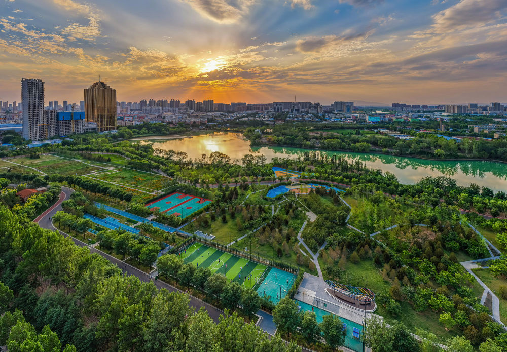 ↑6月5日,山西省运城市舜风公园水清岸绿、景色宜人,市民在公园的球场健身,乐享生态绿色生活。