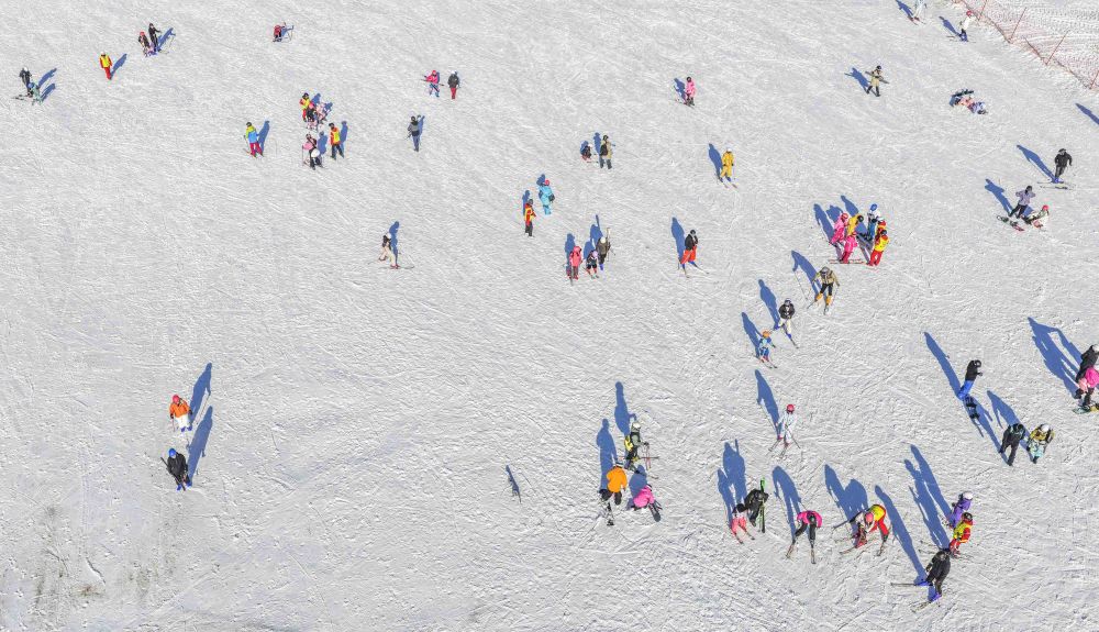 ↑1月25日,游客在阿勒泰市将军山国际滑雪度假区滑雪。