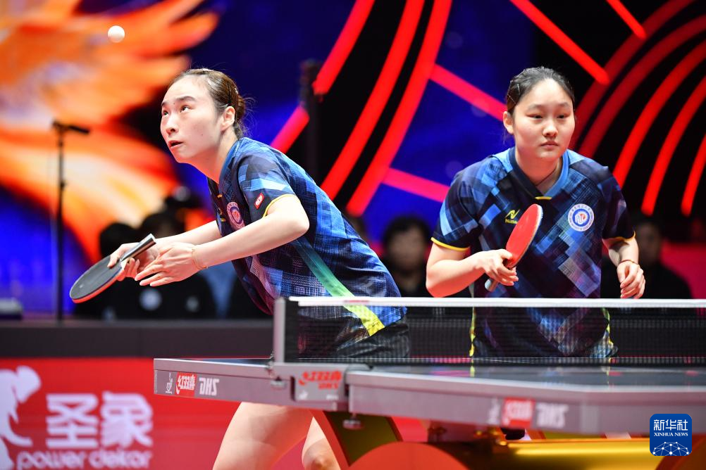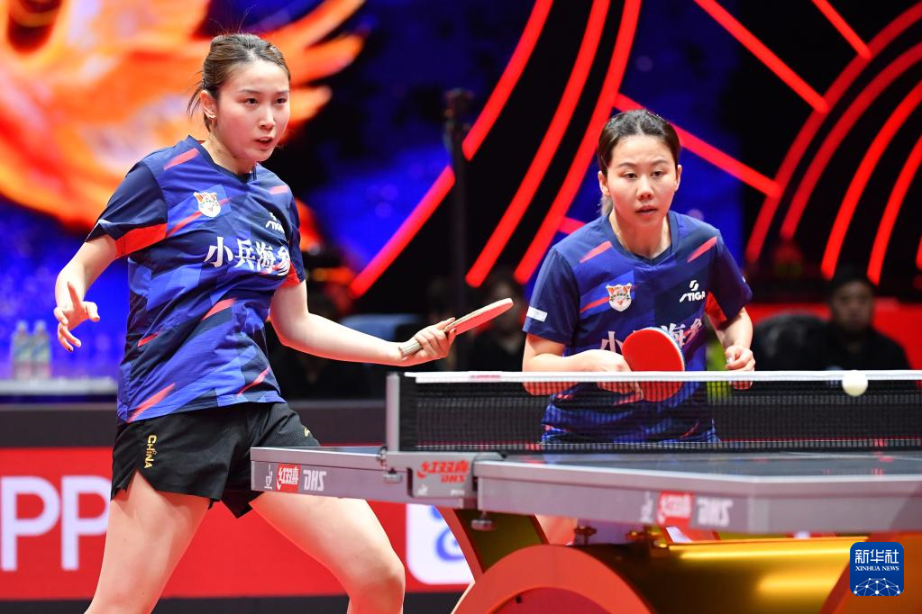 12月26日,山东鲁能队组合陈幸同/钱天一(左)在比赛中。她们3比2战胜华东理工大学队组合李雅可/王晓彤。