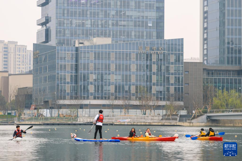 早春时节,一堂水上运动公开课在浙江省宁波市江北区甬江街道星湖公园进行。青年学员们划着皮划艇、桨板,在教练员指导下泛舟湖面,享受水上运动的乐趣。