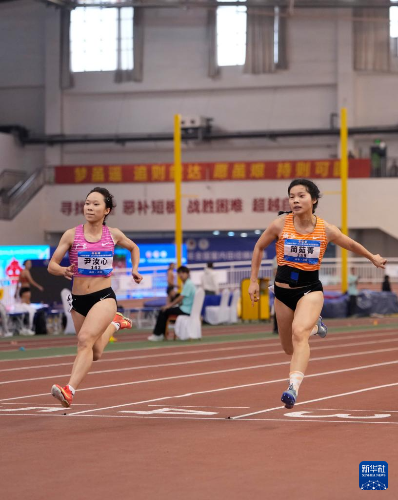 3月27日,广东队选手尹汝心(左)和浙江体彩队选手简茹菁在女子60米决赛中。她们分获冠军和季军。