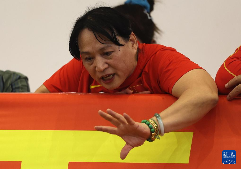 3月27日,山东中泰证券队选手邢家梁的教练丛玉珍在看台与邢家梁交流。最终,邢家梁以20米95的成绩夺得冠军。
