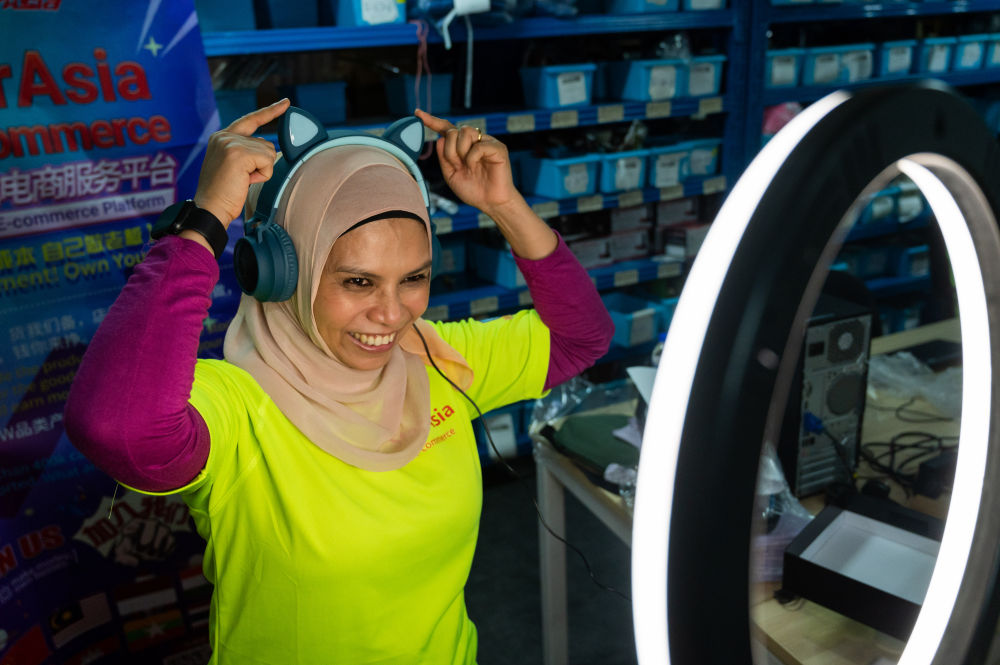 2021年4月14日,在馬來(lái)西亞雪蘭莪州的梳邦再也,佳克琳正在拍攝商品的介紹圖片。新華社記者 朱煒 攝