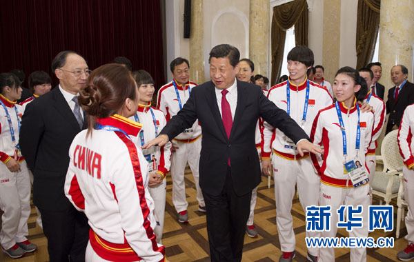??? 2月7日,中共中央總書記、國(guó)家主席、中央軍委主席習(xí)近平在俄羅斯索契親切看望參加第二十二屆冬季奧林匹克運(yùn)動(dòng)會(huì)的中國(guó)體育代表團(tuán)。這是習(xí)近平同運(yùn)動(dòng)員親切交流。新華社記者 黃敬文 攝