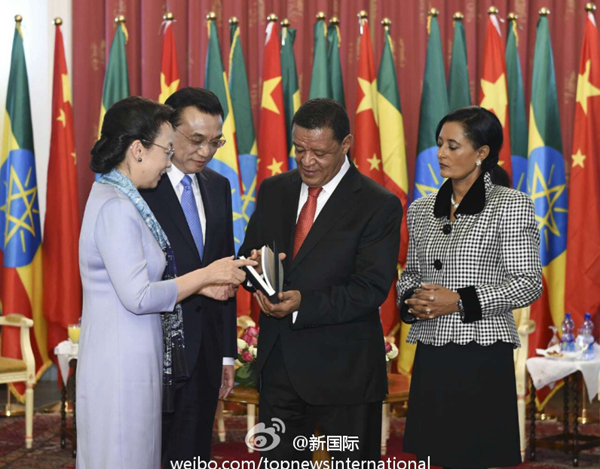 ??? 新華網(wǎng)北京5月6日電? 據(jù)新華社“新國際”微博報道,李克強(qiáng)總理與夫人程虹當(dāng)?shù)貢r間6日上午同埃塞總統(tǒng)穆拉圖夫婦在國家宮會見。會見后,程虹將自己的著作和譯著贈送給穆拉圖總統(tǒng)夫婦。