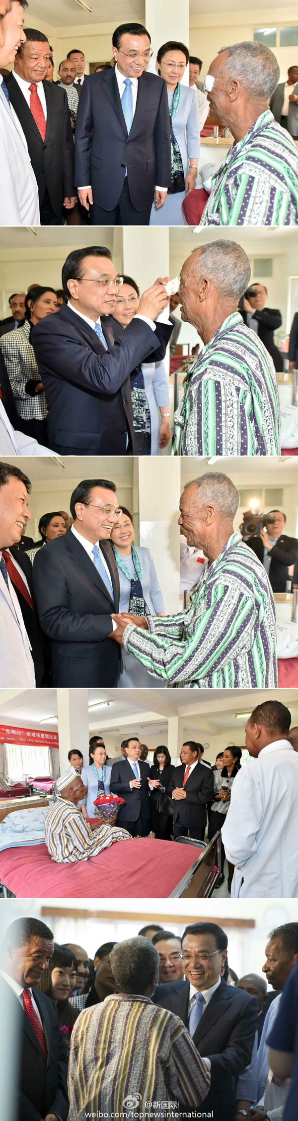 ??? 在親手為埃塞白內(nèi)障治愈患者揭開眼罩后,李克強(qiáng)說,剛才是象征性動作,背后是中非醫(yī)生付出的艱辛和巨大努力,你們一起把光明撒向埃塞普通百姓,是光明使者和真正的天使。