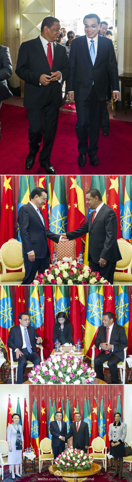 ??? 李克強(qiáng)與夫人程虹6日與埃塞俄比亞總統(tǒng)穆拉圖夫婦在總統(tǒng)官邸國家宮會見。李克強(qiáng)說,我們校友見面格外親切!總統(tǒng)先生在中國學(xué)習(xí)工作多年,為中埃、中非關(guān)系的發(fā)展作出了重要貢獻(xiàn)。穆拉圖總統(tǒng)曾在北京大學(xué)學(xué)習(xí)十余年,是李克強(qiáng)總理的校友,也是“中國通”。