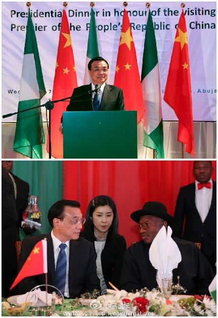??? 新華網(wǎng)北京5月8日電? 據(jù)新華社“新國際”微博報道,當(dāng)?shù)貢r間7日晚,尼日利亞總統(tǒng)喬納森夫婦在總統(tǒng)府為李克強總理和夫人程虹舉行隆重歡迎宴會?,F(xiàn)場尼方兩次奏響中國國歌,感謝李克強在尼安全局勢嚴(yán)峻時刻“冒險”訪問,感謝中方對尼的巨大支持。